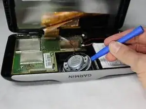 Используя самый большой пластиковый монтажный инструмент, отожмите корпус GPS по бокам. Теперь вы должны видеть всё внутри устройства.
