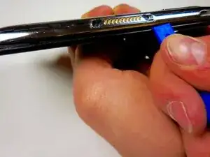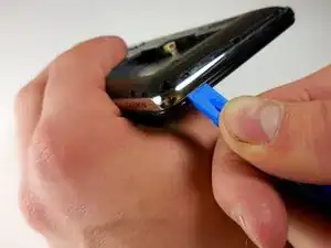 Используйте пластиковый инструмент для открытия, чтобы отжать защёлки на чёрной задней крышке, поддев инструментом рамку по периметру устройства.