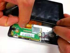 С помощью пластикового лопаткообразного инструмента осторожно отсоедините белую вкладку, соединённую с батареей, потянув вкладку в направлении, противоположном месту её подключения.