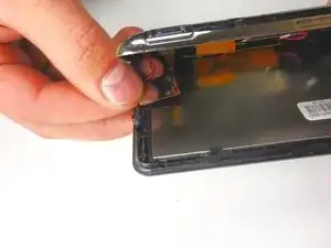 Подденьте пластиковым инструментом защёлки между чёрным экраном и металлической рамкой. Аккуратно обойдите периметр рамки.