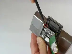Вставьте заострённый конец монтажной лопатки в левую щель вверху крышки антенны, откуда вы ранее вынули плату.