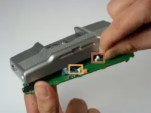 Используйте монтажную лопатку, чтобы отсоединить жёлтый провод антенны от ZIF-коннектора, подняв коричневый защёлкивающий фиксатор, удерживающий провод.
