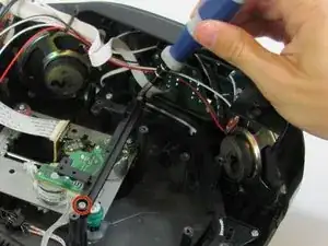 Удалите припой с двух чёрного и белого проводов, подключённых к динамику.