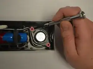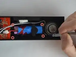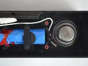 Найдите четыре винта с крестовой головкой Phillips (длина — 5/16", диаметр головки — 1/8"), удерживающие корпус динамика (под аккумулятором), и удалите их.