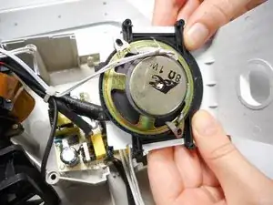 После отключения проводов, чтобы полностью снять динамик, возможно, придётся разрезать пластиковые хомуты, фиксирующие провода динамика.