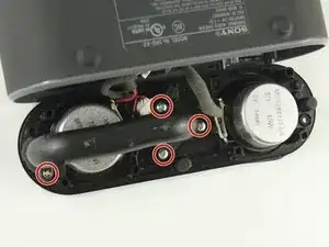 Будьте очень осторожны при снятии монтажной панели динамика (описано в следующем шаге), так как к панели подведены провода. Эти провода припаяны к панели и к корпусу устройства. Провода гибкие, и вы сможете открыть устройство, как показано на второй фотографии.