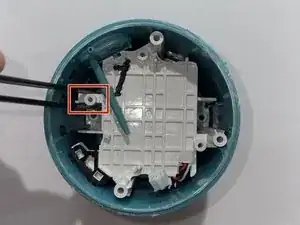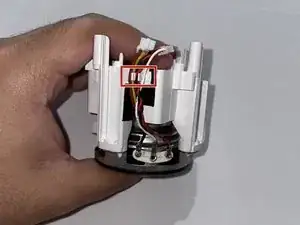 Чтобы отсоединить микрофон от материнской платы, используйте пинцет с нейлоновыми наконечниками, чтобы зажать белый разъём, прикреплённый к красному и белому проводам.