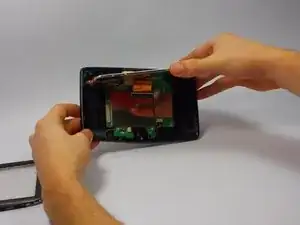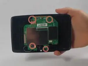 Держите TOMTOM так, чтобы изгиб располагался внизу. Найдите четыре винта Philips 1 мм #J1, прикреплённых к плате за ЖК-экраном.