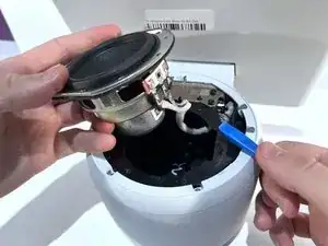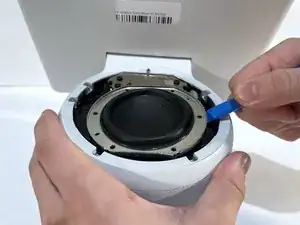 Держите устройство в вертикальном положении, крепко схватите основание и используйте синюю лопатку, чтобы аккуратно поддеть крышку от сетчатой основы динамика.