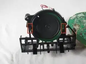 С небольшим усилием нажмите на пластиковые защёлки, оттянув их от себя, чтобы извлечь динамик из его пластикового посадочного места.