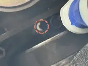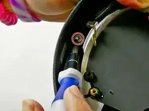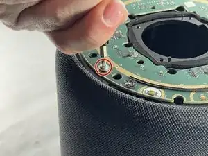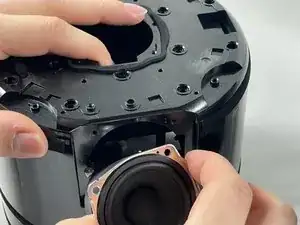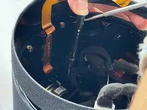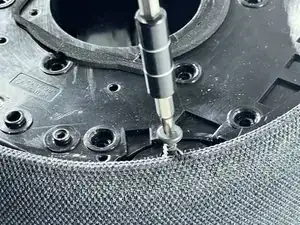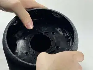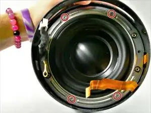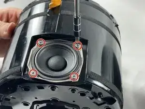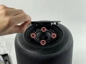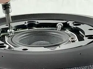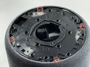На серебристом кольце, расположенном по внешнему краю пластиковой части сабвуфера, находятся четыре винта длиной 2,7 мм. Удалите их с помощью отвёртки Torx T10, чтобы снять сабвуфер.