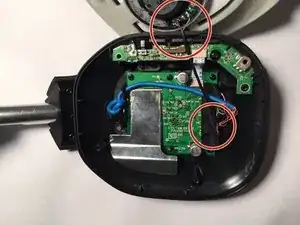 После этого снимите крышку. Если динамик всё ещё подключён и провода внешне не повреждены, то проблема не в динамиках. Вернитесь к странице по устранению неполадок и убедитесь, что у Astro A50 установлена последняя прошивка и т.д. Если провод не подключён — переходите к следующему шагу.