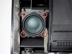 Положите устройство на спинку и удалите четыре винта PH0 длиной 11 мм, крепящие динамик к корпусу.