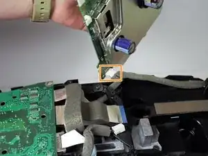 Поднимите блок питания и отсоедините четвёртый кабель с нижней стороны блока питания.
