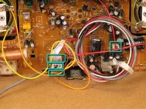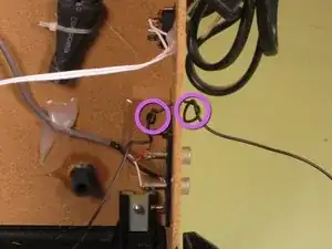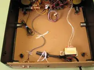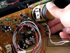 Два белых кабеля припаяны к плате и силовому трансформатору в задней части радиоприёмника. После снятия плату следует разместить в стороне внутри корпуса радиоприёмника.