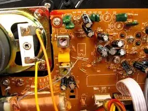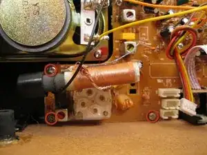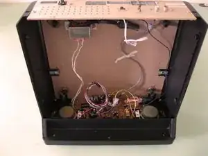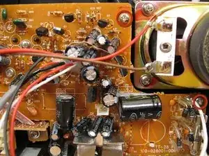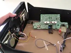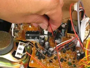 Аккуратно потяните плату прямо назад, осторожно, чтобы не сломать стойки под регуляторы громкости и настройки с противоположной стороны платы.