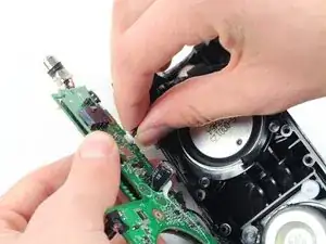 Используя паяльник, выпаяйте два конца платы переключателя. Сначала выпаяйте два вывода со стороны разъема для наушников, так как центральное соединение имеет выемку и должно быть выдвинуто, когда припой расплавлен.