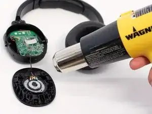 Используйте тепловую пушку, чтобы нагреть клей, соединяющий динамик с корпусом.