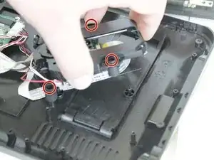 После снятия задней панели и освобождения дискового лотка от дна, найдите два винта 3 мм, которые удерживают лоток на петле.