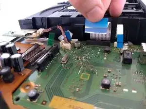 Снимите одну зелёную и три синих защёлки, показанные на фотографии, которые соединяют дисковод с платой. Постарайтесь делать это аккуратно, чтобы не повредить аппаратное обеспечение.