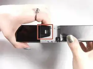 Поднимите язычки, расположенные по обеим сторонам устройства, чтобы освободить переднее покрытие. Начните разделять переднее и металлическое заднее покрытия.