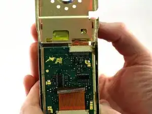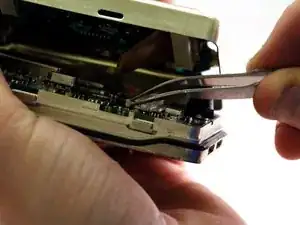 Потяните шлейф пинцетом, чтобы отсоединить от задней панели.
