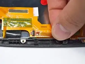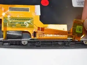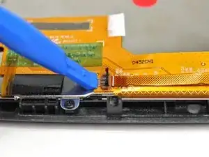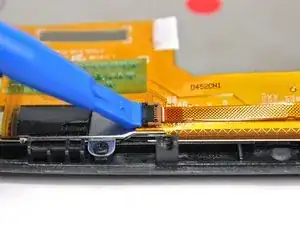 Подденьте маленькую чёрную защёлку на оранжевом разъёме пластиковым инструментом для вскрытия. Это освобождает ленточный кабель, соединяющий дисплей с сенсором.