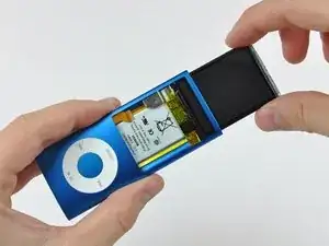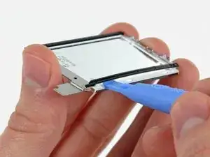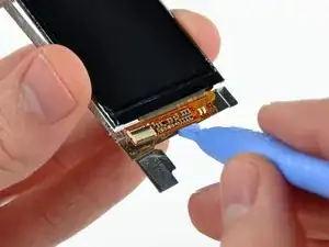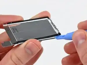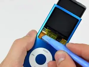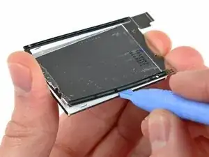 Используйте инструмент для открытия iPod, чтобы отлепить шлейф передачи данных дисплея от тонкой металлической пластины, прикреплённой к дисплею.