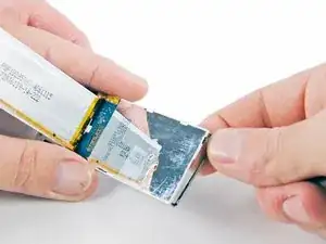 Сверху iPod вставьте металлическую лопатку между наружным корпусом и аккумулятором, чтобы отделить клей, удерживающий аккумулятор на месте.