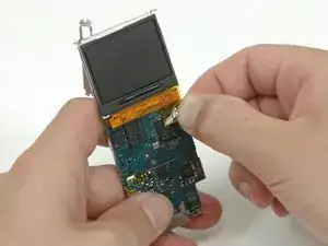 Используйте лопатку, чтобы протолкнуть плату логики через iPod и вынуть её из корпуса. Колёсико управления и гнездо наушников должны остаться в корпусе iPod.