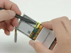 Используйте лопатку, чтобы отключить кабель гнезда наушников от платы логики. Осторожно подденьте разъём в направлении к передней части iPod (или вверх), пока он не отщелкнется от платы логики.