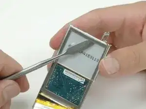Используйте металлическую лопатку, чтобы аккуратно поддеть гнездо наушников из корпуса. НЕ извлекайте гнездо наушников полностью из iPod, так как оно соединено с колёсиком управления через хрупкий ленточный разъём.