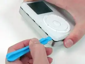 Вставьте пластиковый инструмент для вскрытия iPod в шов между белой пластиковой передней панелью и металлической задней крышкой. Удобно держать iPod сверху и снизу, как показано, и сжимать, чтобы отщелкнуть край. После вставки инструмента проведите им вдоль шва, чтобы освободить пять защёлок, удерживающих iPod вместе.