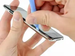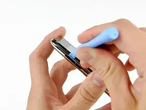 Осторожно вставьте пластиковый инструмент для открытия, рядом с кнопками управления громкостью, между пластиковым окружением экрана и металлическим корпусом.