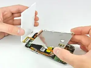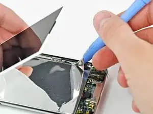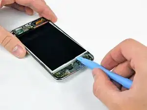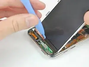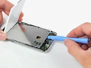 Вставьте небольшой инструмент для открытия iPod с уголком, направленным вверх к нижней части дисплея, между белой пластиковой подсветкой и металлическим экраном под ней.