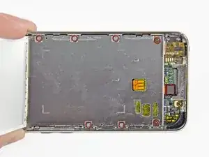 Немного приподнимите металлический лоток дисплея (аккумулятор прикреплен к его нижней стороне) и удалите дисплей с устройства Touch, учитывая его тонкий кабель, который может застрять.
