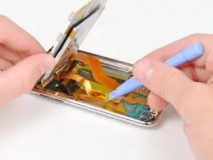Используйте инструмент для вскрытия iPod, чтобы поднять металлический лоток дисплея и повернуть его вверх в сторону верхнего края Touch.