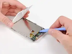 Вставьте маленький инструмент для вскрытия iPod кромкой, направленной вверх, под белый пластиковый подсветочный элемент и металлический экран под ним.