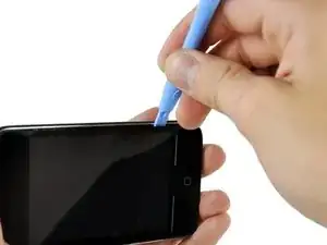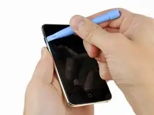 Вставьте инструмент для вскрытия iPod между передней панелью и её пластиковым ободом и подденьте в нескольких точках вдоль левого края Touch.