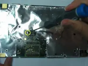 Используя крестовую отвертку #00, открутите винт, расположенный слева от пружинного элемента недалеко от центра материнской платы.