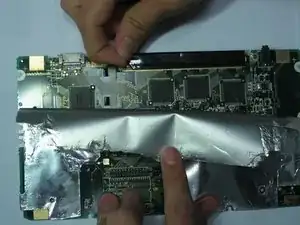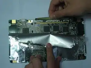 Поднимите материал, покрывающий материнскую плату, начиная с верхнего правого угла. Отделяйте фольгу только примерно до половины длины.