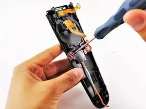 Используйте отвертку T5 Torx, чтобы выкрутить два чёрных винта длиной 5.2 мм на задней серой панели.