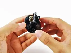 Чтобы облегчить снятие крышки «блюдце», сожмите основание контроллера другой рукой, как показано на втором изображении этого шага. Сжатие упростит освобождение защёлок и поможет предотвратить их поломку.