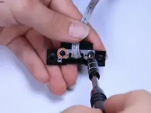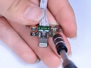 Используя крестовую отвёртку №0, выкрутите два 3-мм винта крестообразного типа с металлической рамки вокруг кабеля Lightning.