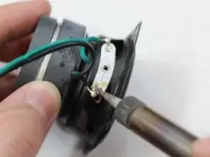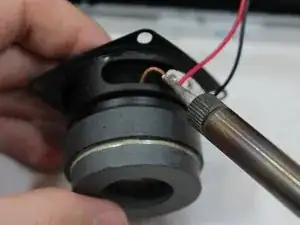 Удалите подсоединенные провода зеленого (левого) и красного (правого) цвета от динамика с помощью паяльной станции.