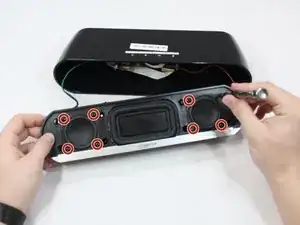 Отвинтите восемь винтов диаметром 10 мм, которые расположены ближе к центру динамиков, поворачивая отвёртку Phillips с битой PH2 против часовой стрелки.