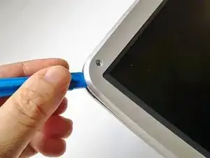 С помощью пластикового инструмента для открытия подденьте крышку экрана от экрана и верхней части устройства.
