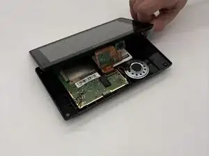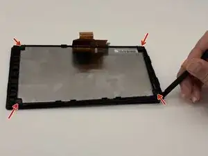 Аккуратно отщёлкните рамку вокруг ЖК-экрана с помощью лопатки. Снимите четыре скобы, расположенные в каждом углу задней части экрана. Осторожно переверните экран и используйте лопатку, чтобы поддеть его спереди, при этом следите, чтобы не треснуть и не согнуть экран.