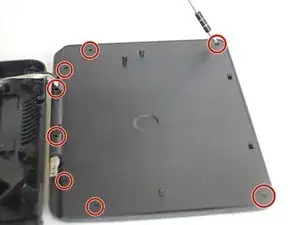 На нижней крышке находятся шесть винтов длиной 9 мм и два винта на шарнире. Открутите их с помощью отвёртки JIS #000.