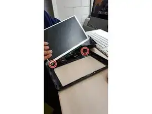 Чтобы получить доступ к двум винтам, сначала удалите 2 маленьких плоских резиновых круга из углов корпуса экрана. При необходимости используйте лопатки.